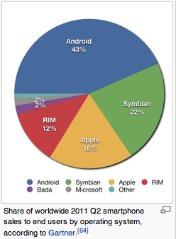Asagida 2011 2. çeyregine ait Akilli Telefon Isletim Sistemi dagilimini gorebilirsiniz. iPhone ve iOS’un “hersey” oldugunu dusunen takintili arkadaslarimizin bilgisine sunmak gerek diye dusundum. (Kaynak: Wikipedia)